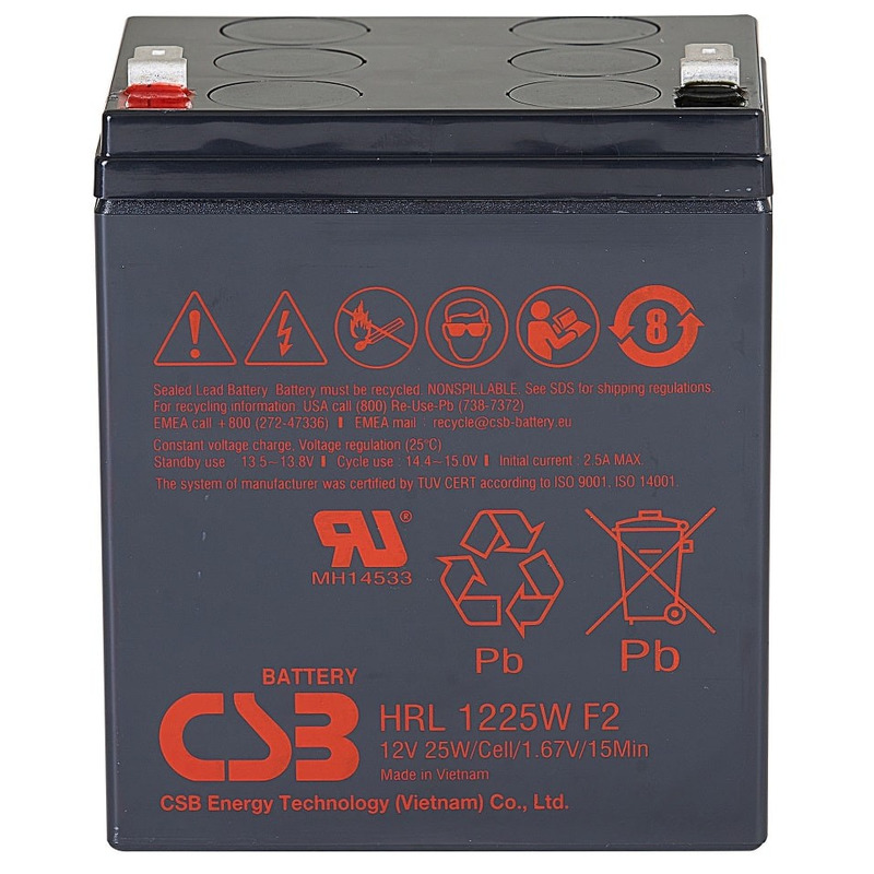 Аккумулятор CSB HRL 1225W - батарея с высокой энергоемкостью. Особенная кристаллическая решетка электродов позволила увеличить на 20% отдаваемую мощность по сравнению с батареями других серий. Она разработана для эксплуатации в режиме высоких токов разряда при коротком времени разряда. Срок службы: 8 лет в буферном режиме (6-9 лет при 20°С по классификации Eurobat) или более 260 циклов заряда-разряда в циклическом режиме при 100% разряде.
